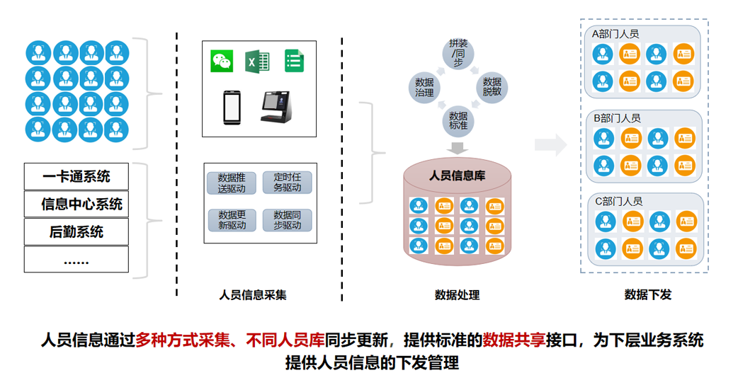 DFMS人员精细化管理应用系统对园区人员综合信息和人员元数据进行统一管理,实现从人员身份信息采集、同步、校验、存储、共享的全流程管理,为第三方系统提供人员综合信息和底层数据服务能力。